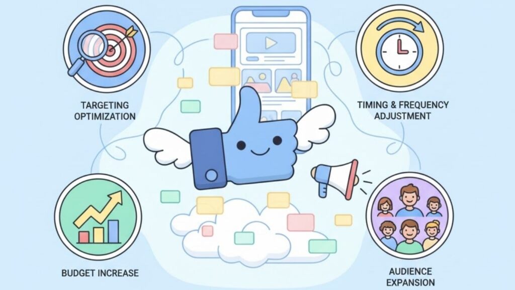 具体的には、年齢層の範囲を広げる、地域設定を拡大する、詳細ターゲット設定の条件を減らすなどの調整が効果的です。